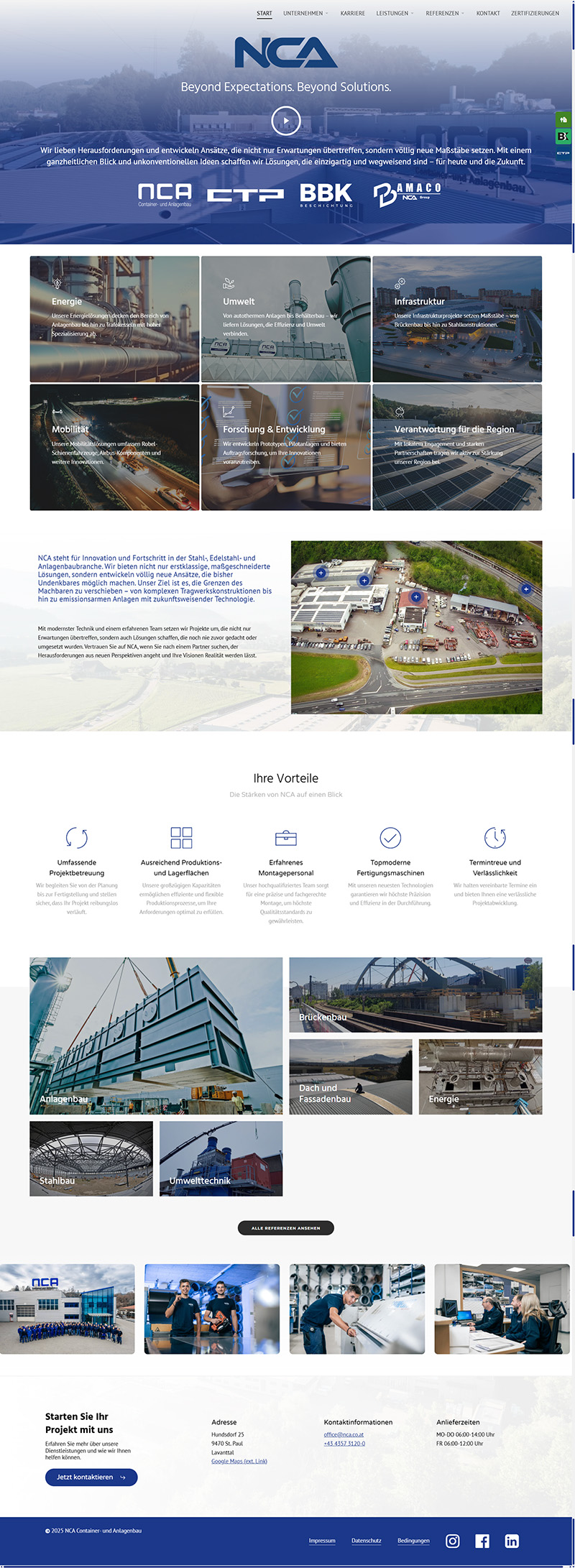 Für die NCA Container- und Anlagenbau GmbH wurde ein Webauftritt geschaffen, der technische Kompetenz, regionale Verwurzelung und strukturelle Vielfalt in ein klares, nutzerfreundliches Design übersetzt. Ziel war es, die umfangreichen Leistungen und das tief verankerte Qualitätsverständnis des Unternehmens digital erlebbar zu machen.